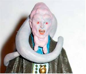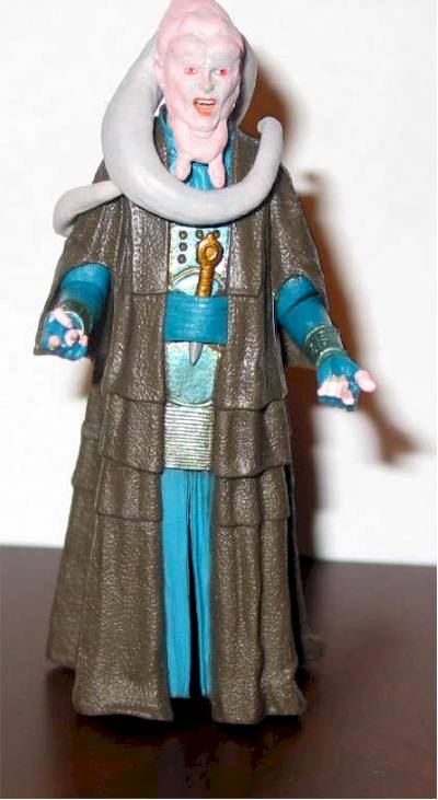 Bib is well painted on all the blue areas however I did find bits on slop on the fingers, neck and other fine lines. This is forgivable however there are some other gaping flaws in the paintjob that lower the score. First of all his robe in the movie was black--there's no doubt about it. The robe here is tolerable with a grayish brown. The main issue for me though it the inconsistent skin tones. Bib has white skin. The head tails (leks) on this figure are white as they should be however, the face is an angry pink tone as are the hands. What happened here? It might not be so noticable in pics but it bothers me in person. The fingers are not noticable as much. Consistency is an issue.