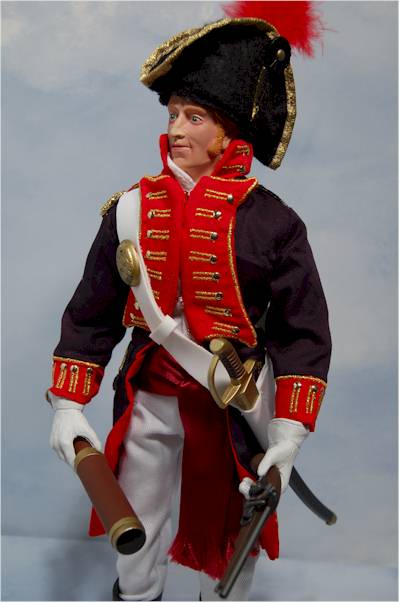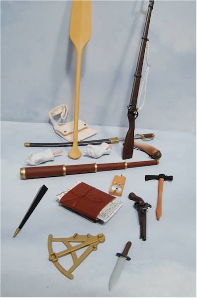 There's no shortage of accessories here - flintlock rifle with strap, flintlock pistol, powder horn, sword and scabbard, sextant, haversack, bayonet with its own scabbard, compass (that opens and closes), knife, tomahawk, paddle, extra set of hands, telescope, and a pleather 'case' that holds various dispatches and maps.
