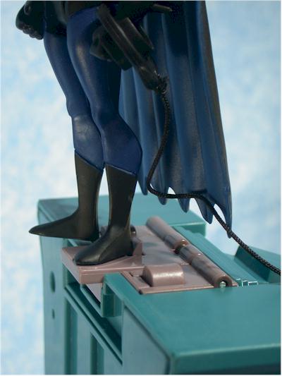 Batman can be placed on a foot pad on top of the building. Oddly, he faces the back of the building, but that's so he does a flip