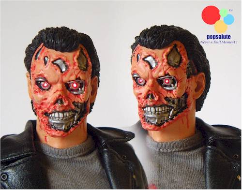 Governor of California any royalties, and have, as Tim Burton said of Planet of the Apes, re-imagined the sculpt. So once you've got your head round the fact this is 're-imagined' you will see just how cool the sculpt is. Where flesh meets metal the fine sculpting is brilliant, enhanced greatly by some great paint ops, but more on that later. As you can hopefully see from my photos there's a lot of fine sculpting on the hair too. Lastly the gloved hands, these are as ravaged as his face, covered in holes revealing bits of flesh and endoskeleton. Superfine attention to detail with some deep sculpting and accurate casting again highlighted by some fantastic paint ops. Now onto one of this figure's coolest features, I wasn't sure what