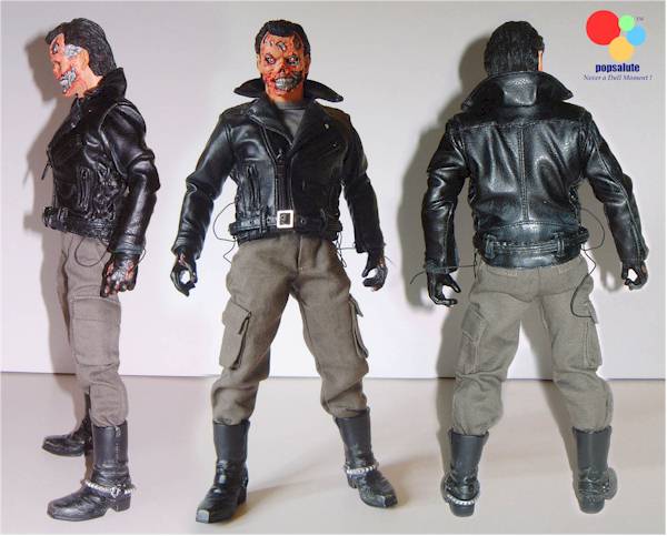 For those of you who read the Popsalute T-850 review, you'll know I said the leather jacket on that was in my opinion the best 1/6 scale I'd seen, well this quite frankly dumps on it from a great height. I happen to own a Schott 'Perfecto' biker jacket as worn by and indeed designed for Marlon Brando in 'The Wild One' also favoured by James Dean and Steve McQueen, so I'm in good company (pity it doesn't fit me anymore). So I can say with a small degree of authority that this is pretty damned accurate. The scale zips on the pockets and cuffs even work....now that's nice! The rest of his outfit is nicely