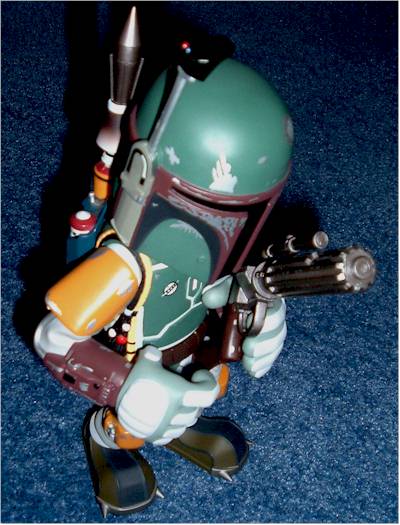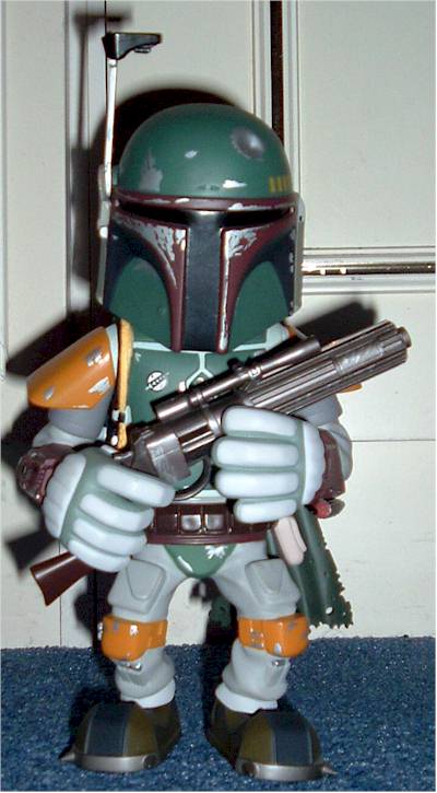 Displayers BEWARE! My Boba was out for a little while as I set him up to take some pics and I knocked him off my 3 foot cabinet only to the carpet. To my horror his helmet aerial snapped CLEAN OFF :o( I have superglued it back on but now it is has obviously decreased in value, and I cannot move it at all as it is stuck fast.